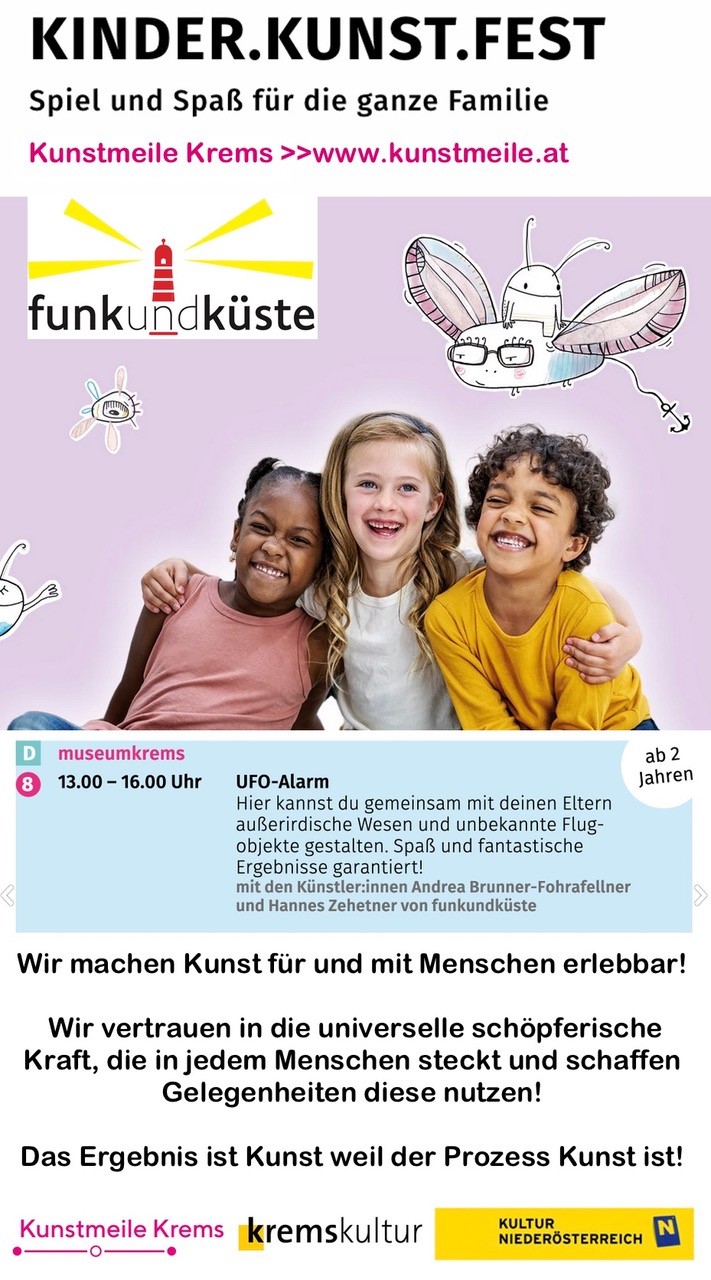 Wir waren am 26. 10. wieder mit Freude beim KINDER KUNST FEST der Kremser Kunstmeile vertreten. 62 Personen, Eltern und Kinder von 2-10 Jahren folgten dem „UFO-Alarm“ und gestalteten gar wundervolle Aliens.